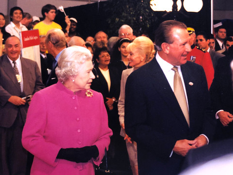 I took Wednesday, October 9 off of work and headed for the CNE grounds in Toronto with my fiancée. By the time the event started at 4 o’clock, we were ready. We were dressed in business attire, with my fancy SLR camera draped around my neck, and extra rolls of film in my suit jacket. We presented our invitations, and were welcomed into the Festival of Ontario. There were a couple dozen exhibitors along the promenade, representing Ontario’s history, progress, industry, recreation, and multiculturalism. The Queen had not yet arrived, so we were free to wander around. I wasn’t exactly people-watching, but I did encounter retired CBC News anchor Knowlton Nash as we passed each other. Primer Ernie Eves arrived with his entourage. Eves was to be the Queen’s guide to the proceedings, so it wouldn’t be long until she appeared.