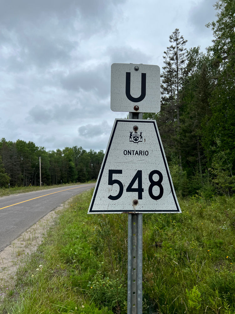 Yay, a highway sign. But it's the lesser-seen secondary highway type. And what's with the U tab on top? Well, this highway covers St. Joseph Island. It goes south from Highway 17, crosses a bridge, and then follows a stirrup-shaped course around the island, such that it intersects with itself at one point. The highway follows the concession lines of the island, which are named with letters of the alphabet: There are names such as A-Line, B-Line, etc. So to help locals figure out which part of the highway they're on, a tab is added to the sign to denote the concession a particular portion of highway follows. There is no use for cardinal direction tabs on these signs; traffic headed "north" could be moving along the eastern or western shore of the island, since it's a continuous loop.