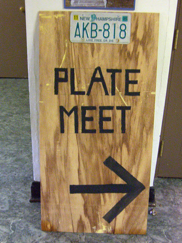 The church, I thought, was a great venue for a license plate meet. The size was just about perfect. There were no unused tables anywhere, and yet, we weren’t short of space. It seemed that every corner of the hall was used, and so there was something interesting to see wherever you went… as opposed to sparse meets where empty spaces abound. The hall had a warm, cozy feel to it, which I appreciated on such a cold, wet and windy fall day. It smelled great, too. Possibly the best aspect is the catwalk that runs along the walls, twenty feet above the meet floor, accessed by a couple of unassuming staircases that I discovered in the back. They made for a great bird's-eye-view for our group photo. I’d like to go back there for another swap meet. I hope Don books it again next year.